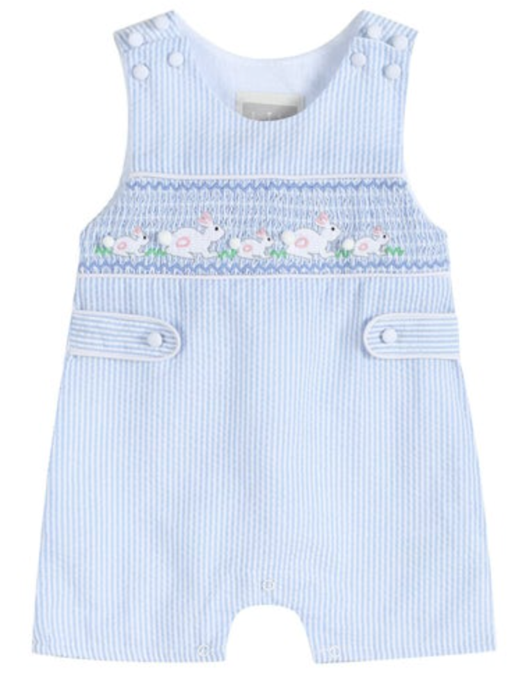 Bunny-tastic! He'll be irresistible in this adorable Bunny themed Shortalls. Made in a blue seersucker 100% soft cotton to ensure all day comfort. Features a charming bunny embroidery on smocking, coordinating 2-button closure for sizing adjustments and snaps for easy diaper changes. Your little boy will be perfectly dressed (and camera ready!) for all your Easter adventures.