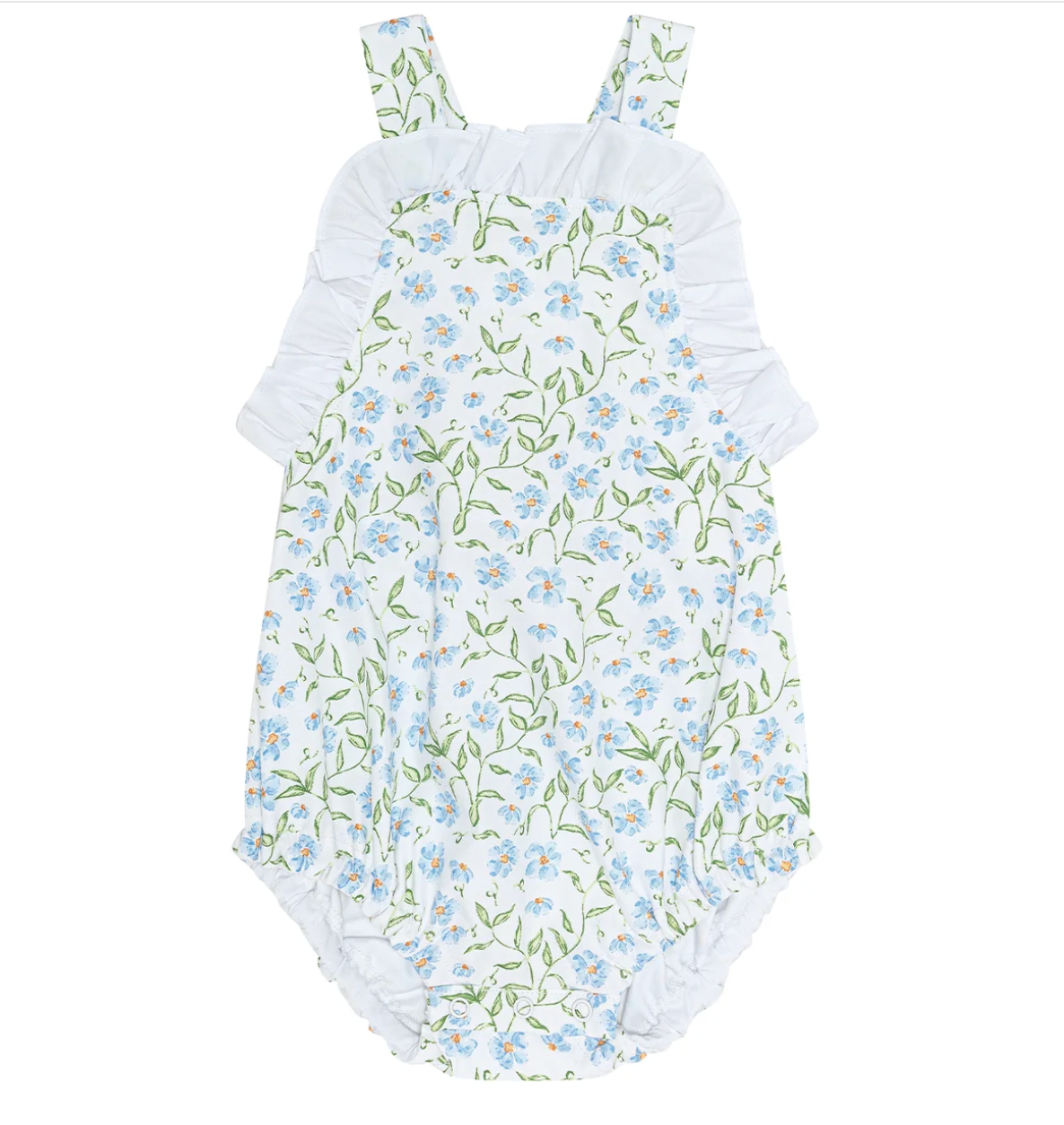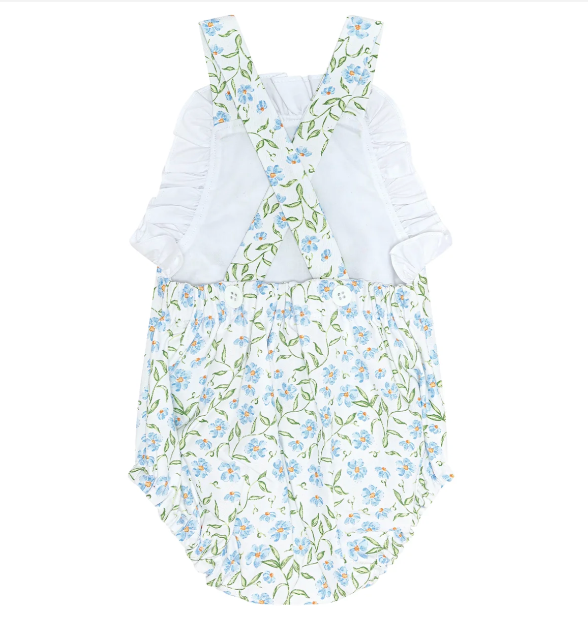 Charming and refined, the Blue Vines Woven Summer Bubble is perfect for warm-weather outings and special moments. Made from 100% premium woven Pima cotton, this bubble offers a structured yet lightweight feel for an elegant look. It features delicate cross-back straps and a ruffled detail on the chest, adding a touch of timeless charm to the design. The elasticized leg openings ensure a comfortable fit, while the signature blue vine floral print adds a playful finish.