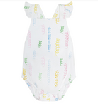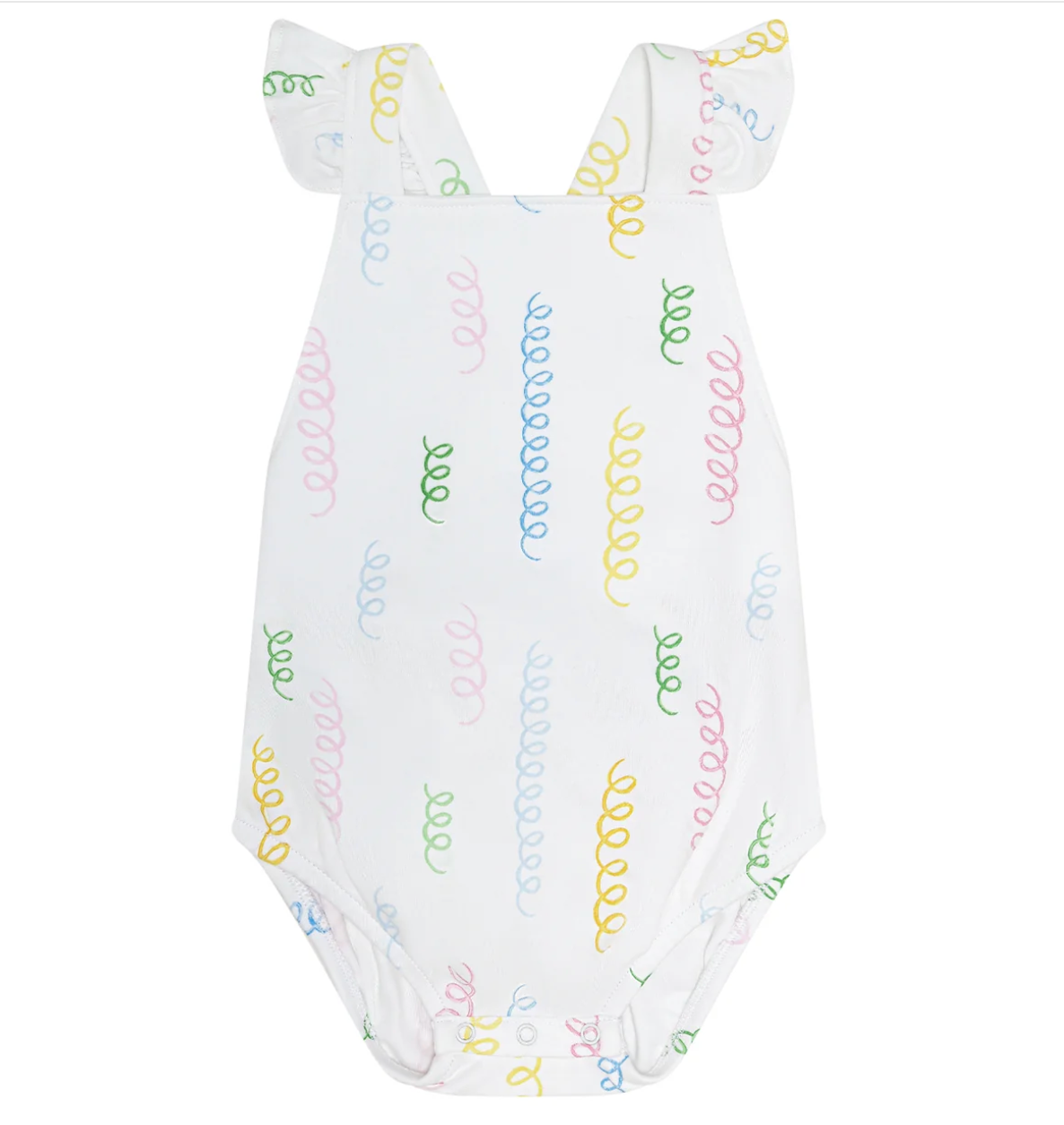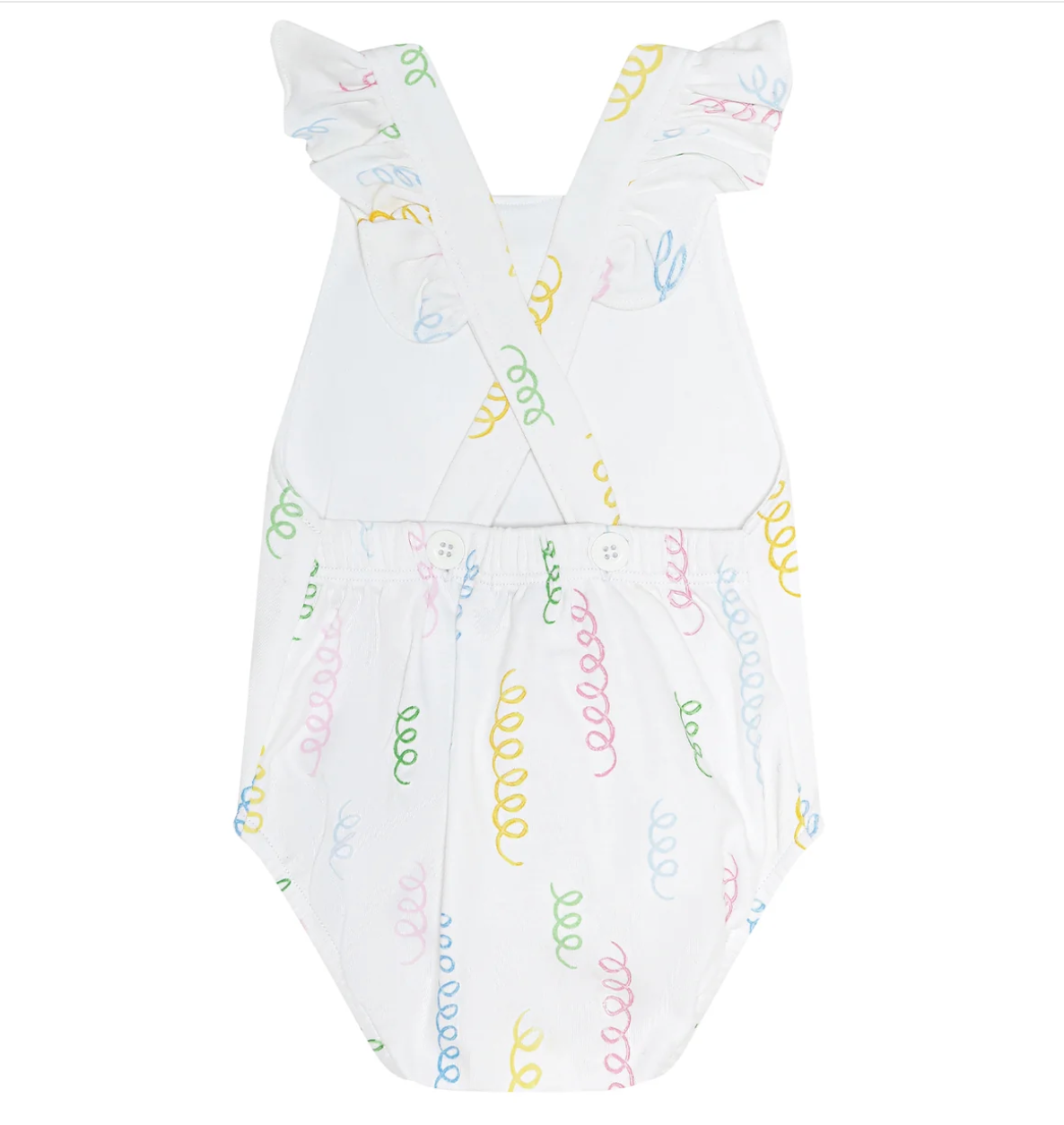 Perfect for warm weather outings, this Ruffle Bubble features a cross-back design and delicate ruffle details, enhanced by the vibrant Spirals print. Made with 100% Pima cotton from Nella Pima, it’s lightweight, breathable, and gentle on sensitive skin.