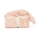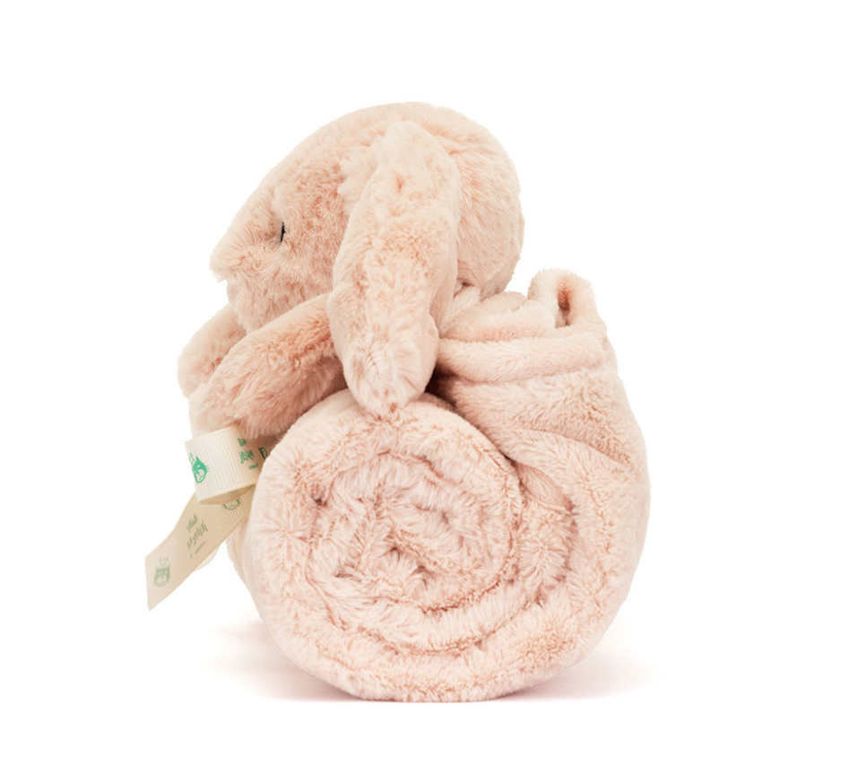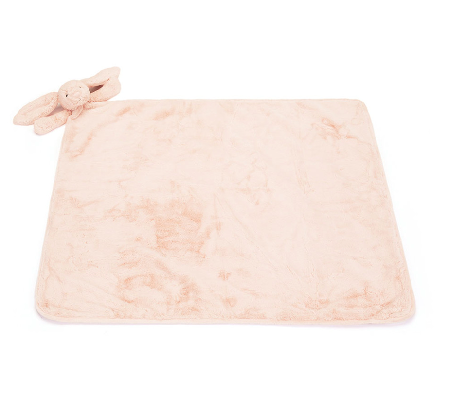The Bashful Blush Bunny Blankie combines our most loved Bashful Bunny character’s long lop ears, pink suedette nose, embroidery eyes and soft squashy paws with a blankie made from the same cloud soft, blush soft pink coloured fur in recycled fibres. Neatly rolled and tied with a Baby Jellycat grosgrain ribbon, this is an exquisite gift of endless comfort and timeless charm.
