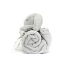 The Bashful Silver Bunny Blankie combines our most loved Bashful Bunny character’s long lop ears, pink suedette nose, embroidery eyes and soft squashy paws with a blankie made from the same cloud soft, silver-grey coloured fur in recycled fibres. Neatly rolled and tied with a Baby Jellycat grosgrain ribbon, this is an exquisite gift of endless comfort and timeless charm.