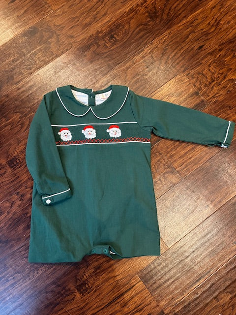 Santa Smocked Dark Green Shortall, size 24 months, is perfect for holiday celebrations!