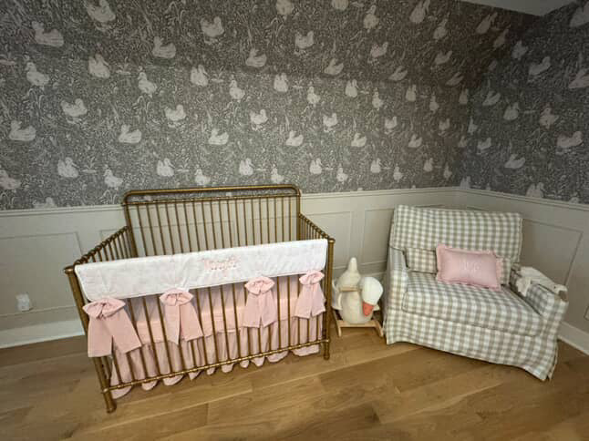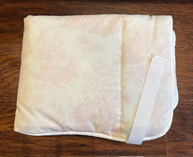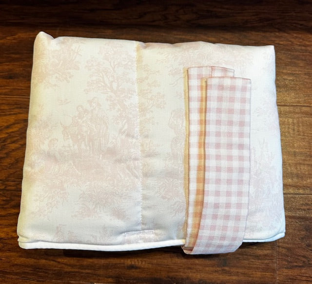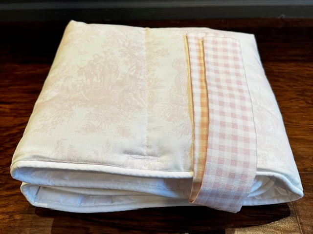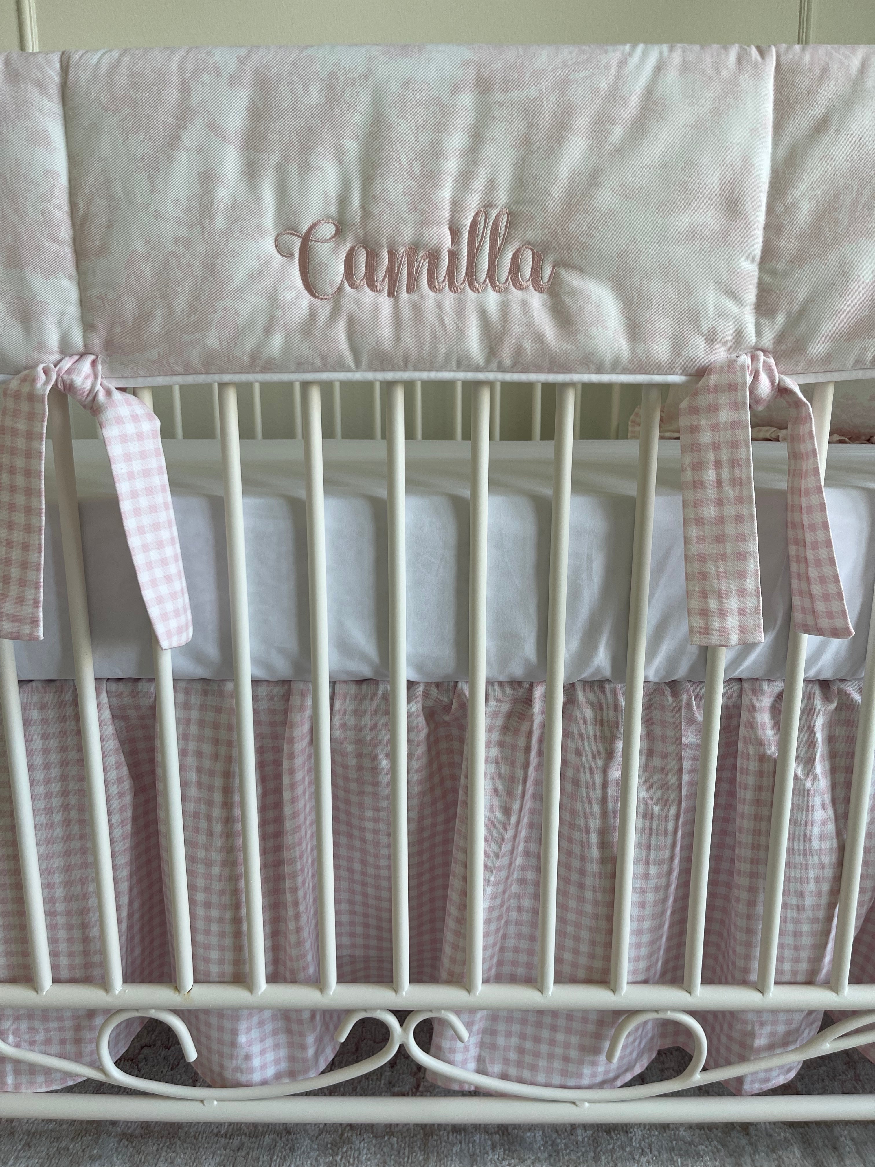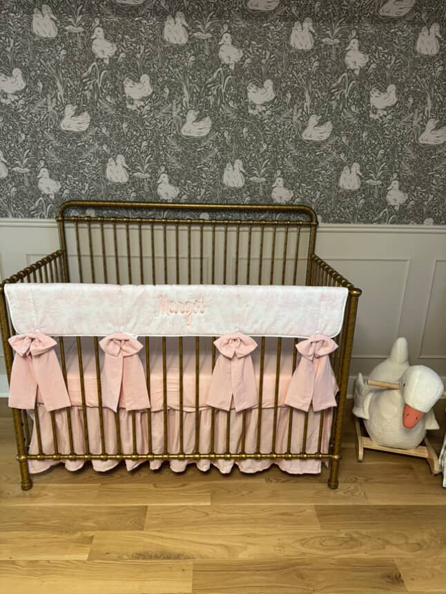 Liz and Roo crib rail covers are 17″ when laying flat and 9″ when folded. We also offer a few styles in an 11" width for iron cribs or cribs with small rails. Side rail covers are custom made in any fabric.