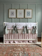 This luxury Hydrangeas and Bows scalloped crib rail cover features an exclusive design to Liz and Roo. The hydrangeas and bows design combines pink, cornflower, and green hues with a scallop detail and light pink gingham ruffle. This unique crib rail cover is a perfect baby girl nursery set. Also available in a bedding set with coordinating crib skirt, crib sheet, changing pad cover, and pillow. Matching curtains are also available. Made in USA.