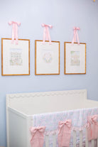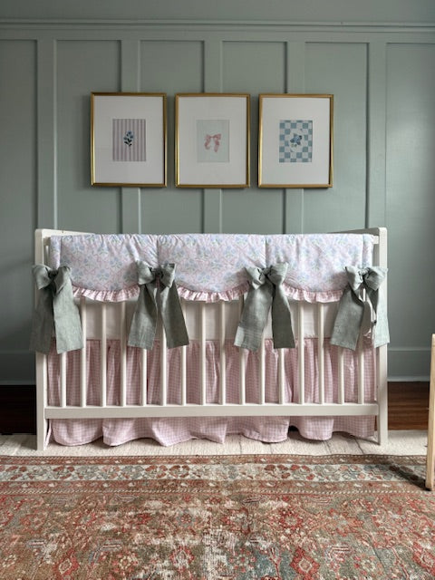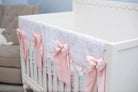 - Hydrangea and Bow scalloped crib rail cover features a light pink gingham ruffle trim and finished with white cording (monogram $20 extra). The crib rail cover is