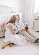 - A petal pink linen blend or a white cotton twill crib sheet, include your preference in the notes at checkout