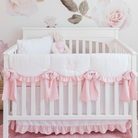 This 7-pc. White and Pink crib bedding set provides a stylish, modern look to your baby's nursery. Featuring a crisp white scalloped crib rail cover with pink ruffles (monogram optional) and skirt with matching pink ruffles. If you are looking for a white nursery with a little bit of blush pink, this is for you! Set Includes: