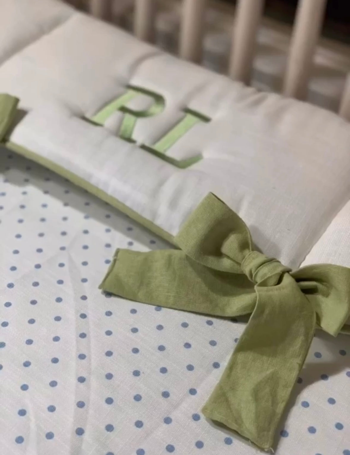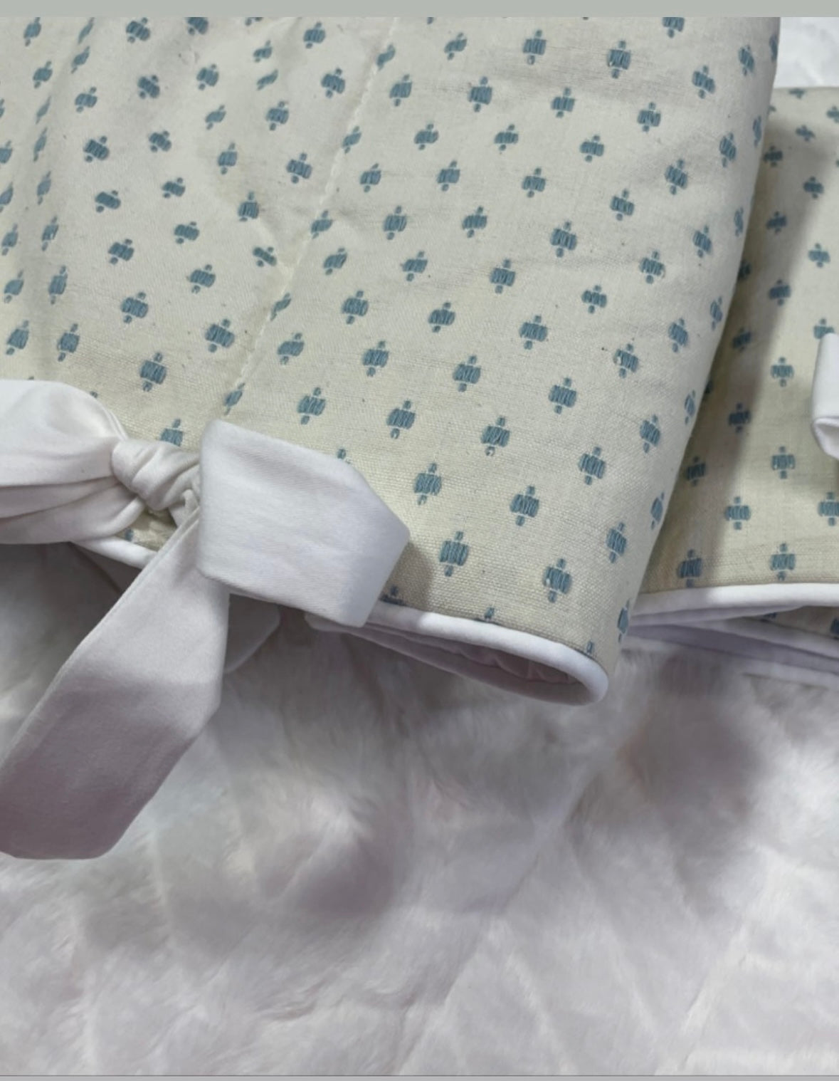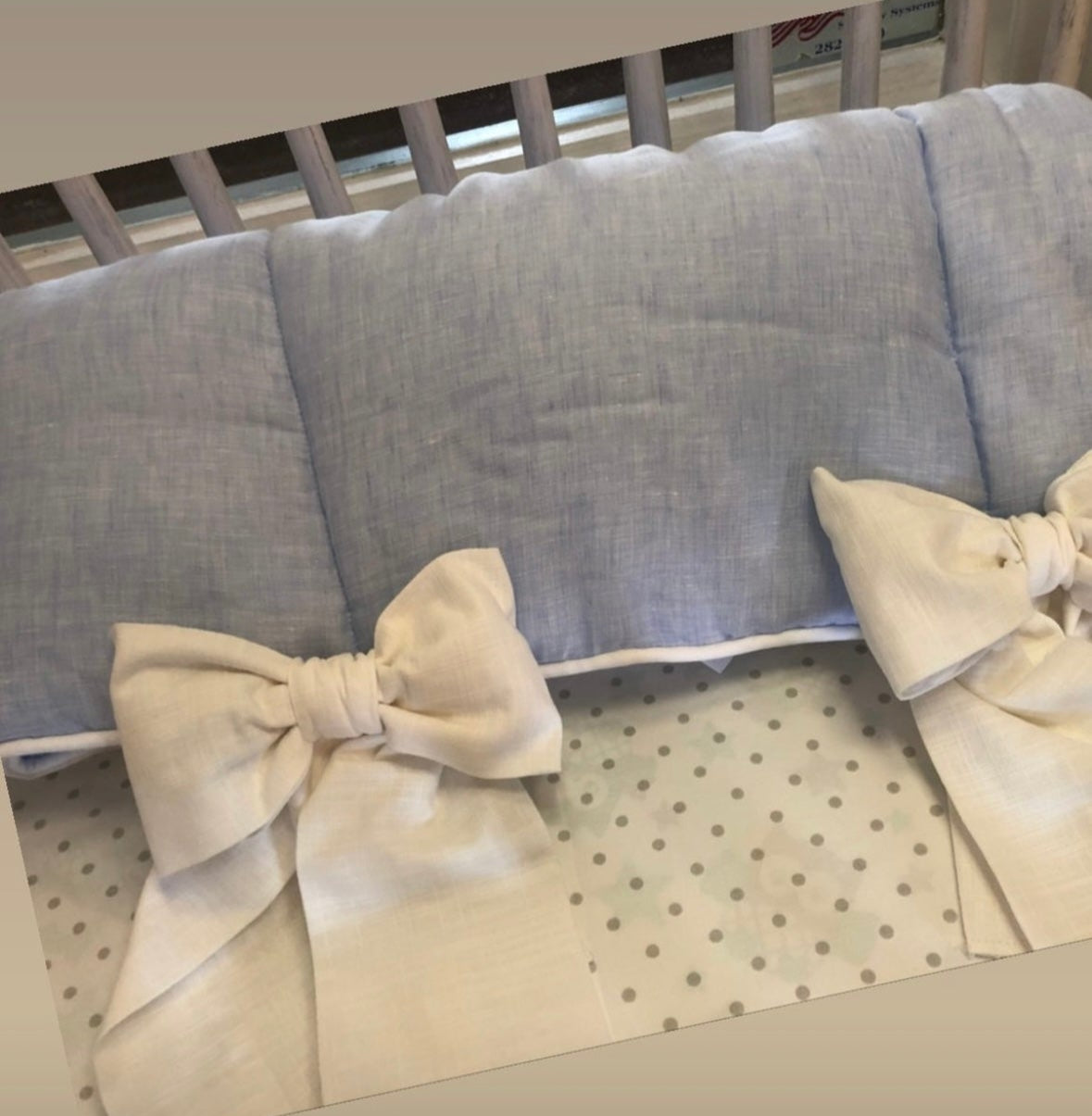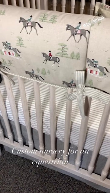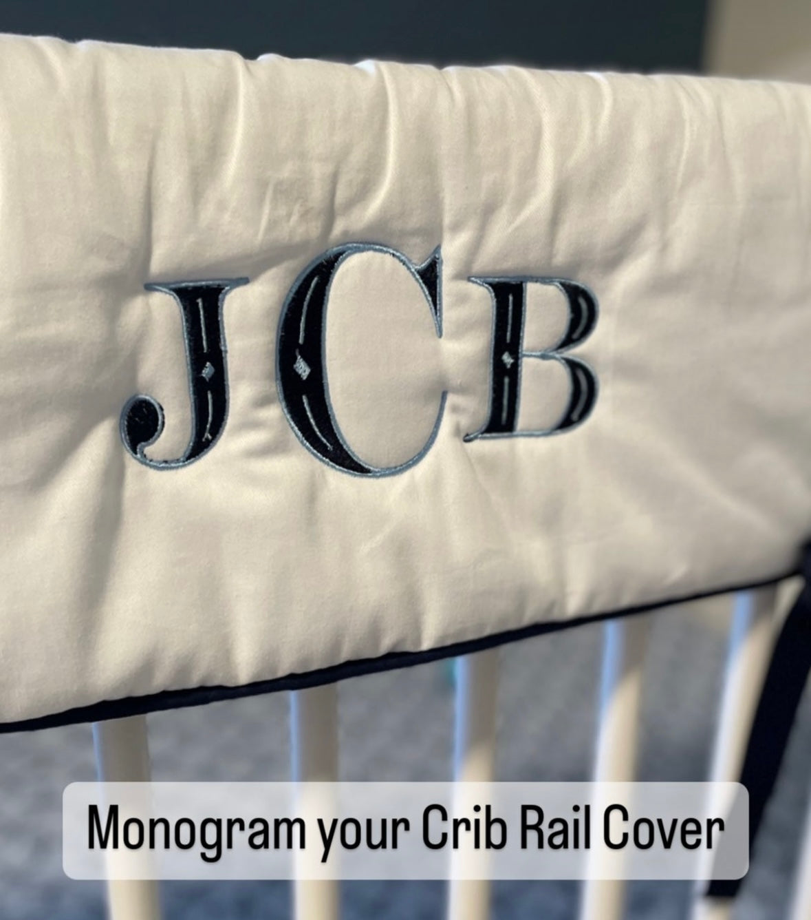 We can make a custom rail cover in any fabric and in the style you want! Shown here are a few examples. In the Notes section of your order include details like a ruffle, knot ties, etc. We can make oversized rail covers for a crib with a large wood front, as well. We will contact you to confirm the details of your order before we begin making it.