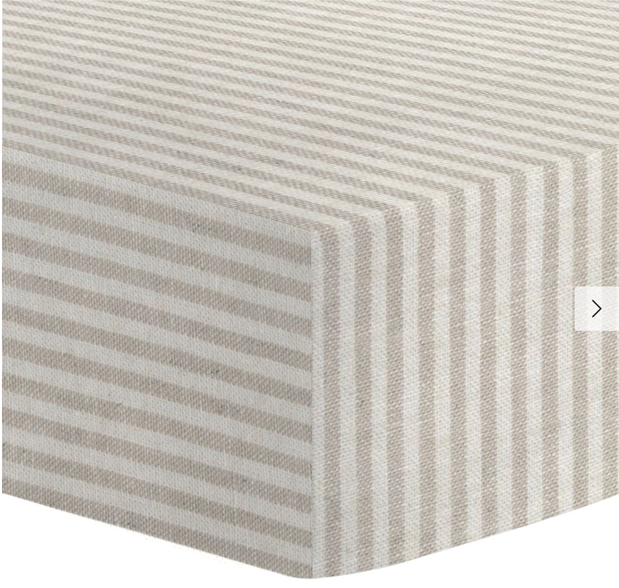 - Flax Stripe Crib Sheet: linen cotton blend sheet that fits standard crib.