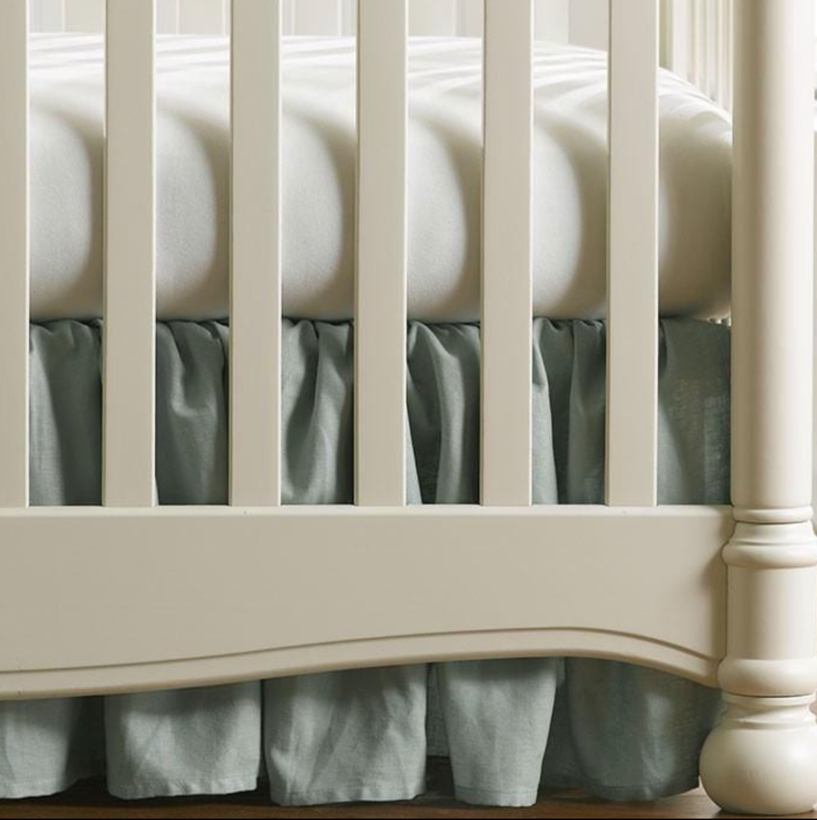 Linen/Rayon blend for ease of care; Cotton/Poly Deck Top. Has a deck top and split corners for ease of set up on crib. Fits All Standard Cribs- with a 28”x52” standard crib mattress. Features a 16” drop that is perfect for varying crib heights. Four sided.